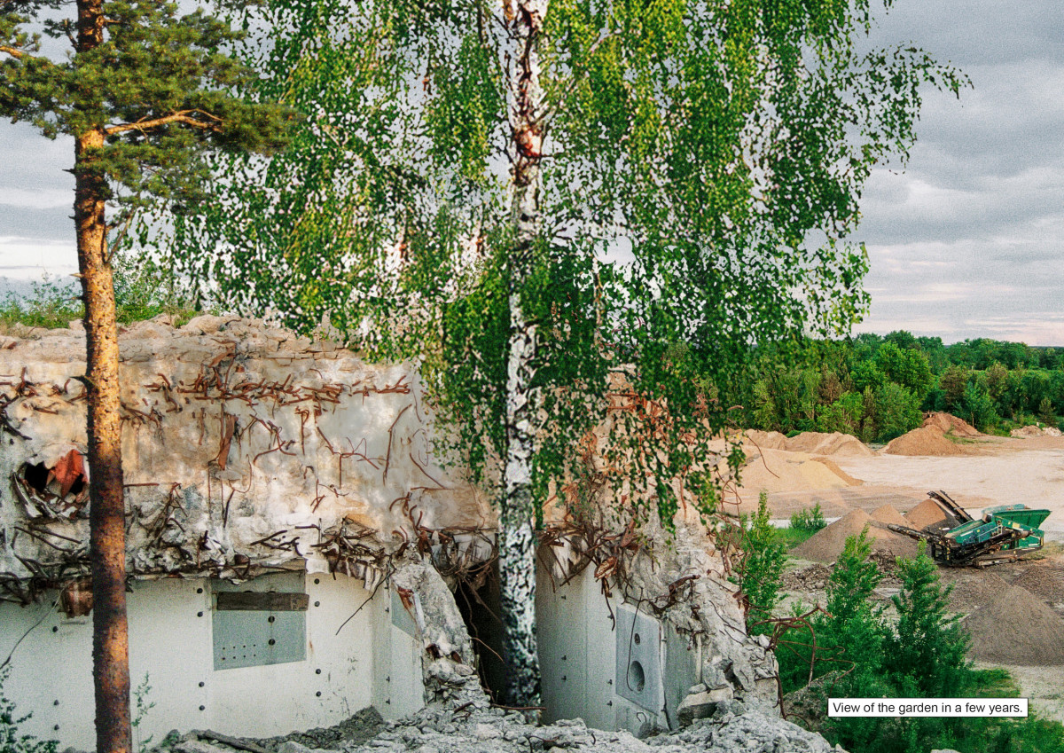Der Garten wird als dritte Landschaft in einem Gebiet angelegt, das vom Menschen stark verändert und zerstört wurde und nun verlassen ist. Alle Pflanzen des Gartens sind bereits etabliert. Zwischen den Betonblöcken und Trümmern wachsen sehr kleine Birken, Pappeln, Eschen, Bergahorne und Robinien.
