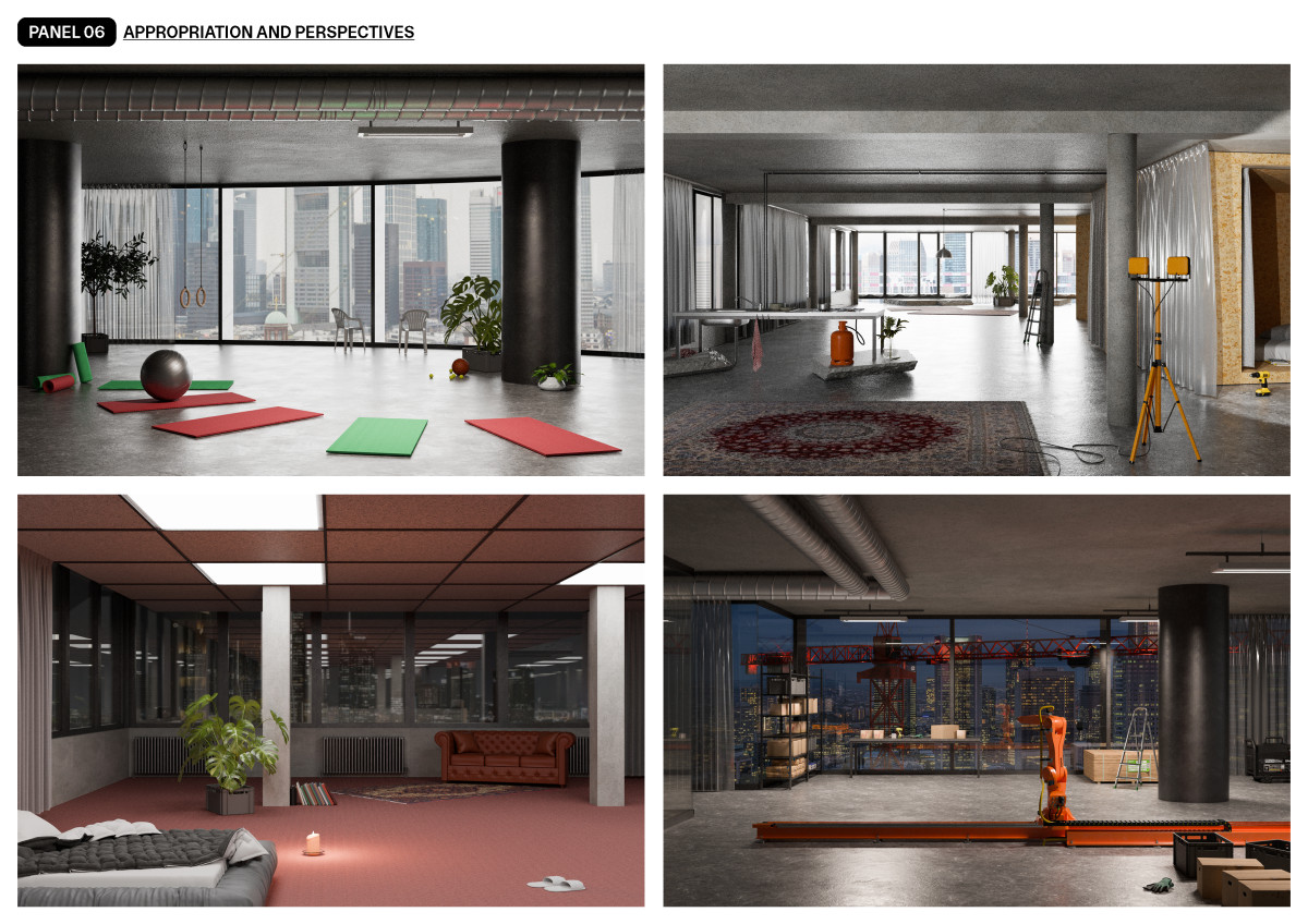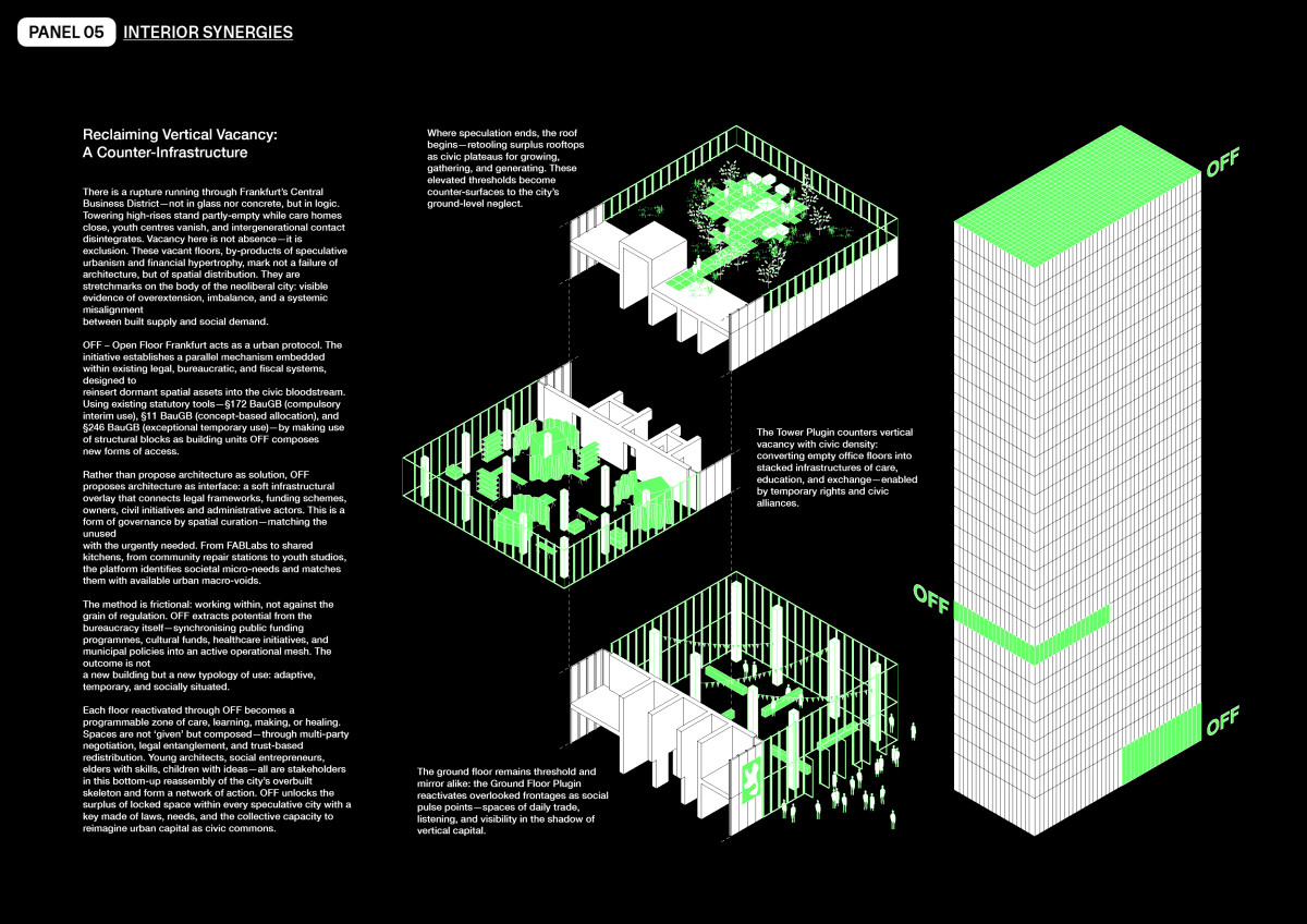 Jede durch OFF reaktivierte Etage wird so zu einer programmierbaren Fläche für Pflege, Lernen, künstlerisches Schaffen oder Heilung. Räume werden nicht „verschenkt“, sondern durch Verhandlungen zwischen mehreren Parteien, rechtliche Verflechtungen und vertrauensbasierte Umverteilung umgewidmet. Junge Architektinnen, sozial ausgerichtete Unternehmerinnen, ältere qualifizierte Menschen, Kinder mit Ideen – sie alle sind Akteure in dieser Bottom-up-Neugestaltung des überbauten Skeletts der Stadt und bilden ein Netzwerk des Handelns. OFF öffnet die überschüssigen verschlossenen Räume in jeder spekulativen Stadt mit einem Schlüssel aus Gesetzen, Bedürfnissen und der kollektiven Fähigkeit, städtisches Kapital als gemeinschaftliches Gut neu zu denken.