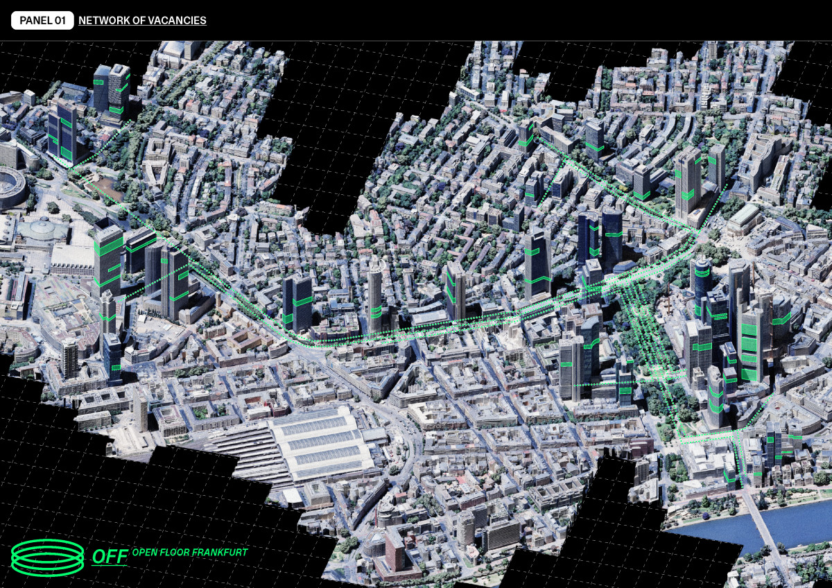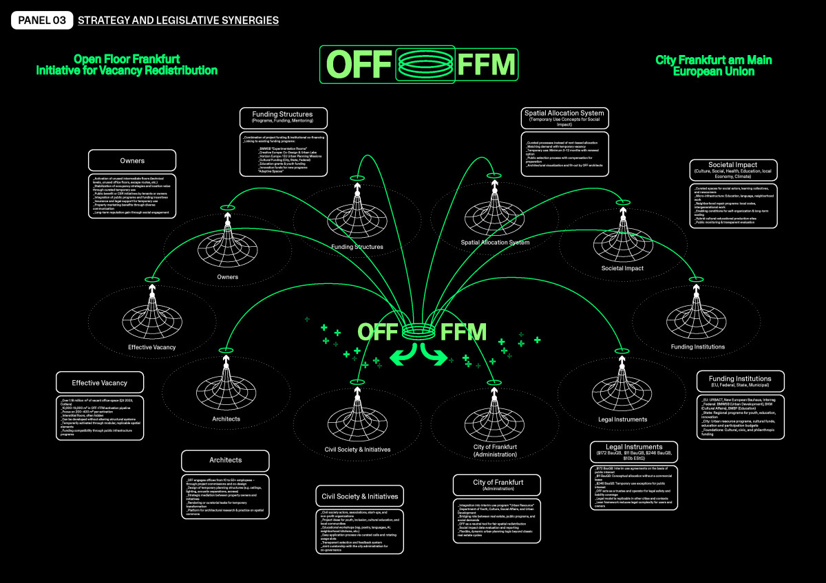 OFF – Open Floor Frankfurt fungiert als urbanes Protokoll. Die Initiative schafft einen parallelen Mechanismus, der in die bestehenden Rechts-, Verwaltungs- und Steuersysteme integriert ist und darauf abzielt, ungenutzte Gebäudeflächen wieder in den städtischen Kreislauf einzubinden. Unter Verwendung bestehender gesetzlicher Instrumente – §172 BauGB (vorläufige Nutzungspflicht), §11 BauGB (konzeptbasierte Zuweisung) und §246 BauGB (Sondergenehmigung für eine vorübergehende Nutzung) – und unter Nutzung von Strukturblöcken als Baueinheiten schafft OFF neue Formen des Zugangs.