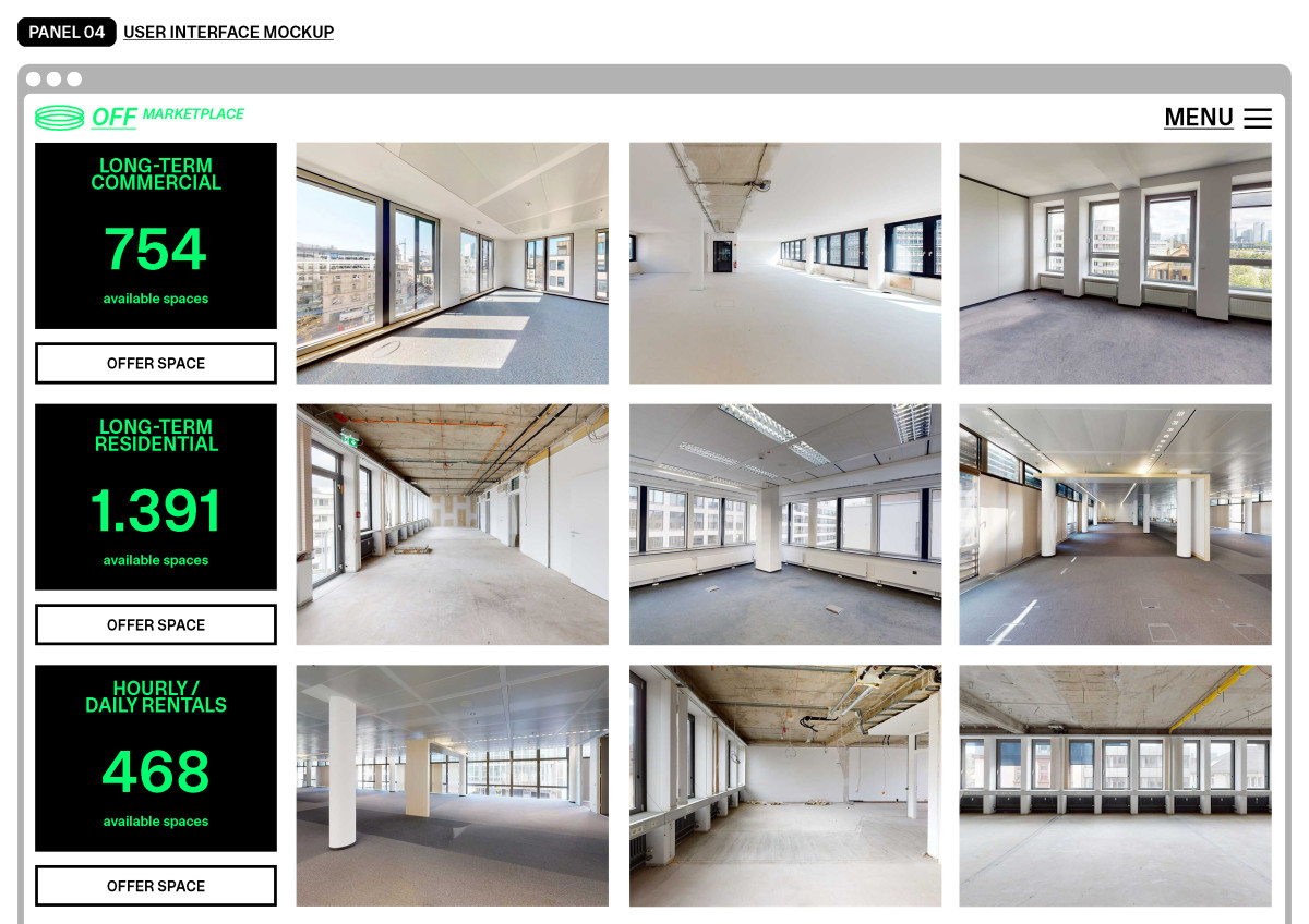 Anstatt Architektur als Lösung selbst vorzuschlagen, sieht OFF Architektur eher als Schnittstelle: eine Überlagerung flexibler Infrastrukturen, die rechtliche Rahmenbedingungen, Finanzierungsmodelle, Eigentümer*innen, zivilgesellschaftliche Initiativen und administrative Akteure miteinander verbindet. Es handelt sich um eine Form von Lenkung durch räumliche Kuration, bei der ungenutzte Ressourcen mit dringenden Bedürfnissen in Verbindung gebracht werden. Von FABLabs, über Reparaturwerkstätten für die Nachbarschaft, Künstlerateliers für Jugendliche bis hin zu Gemeinschaftsküchen ermittelt die Plattform gesellschaftliche Mikrobedürfnisse und verbindet sie mit verfügbaren städtischen Makro-Leerständen.