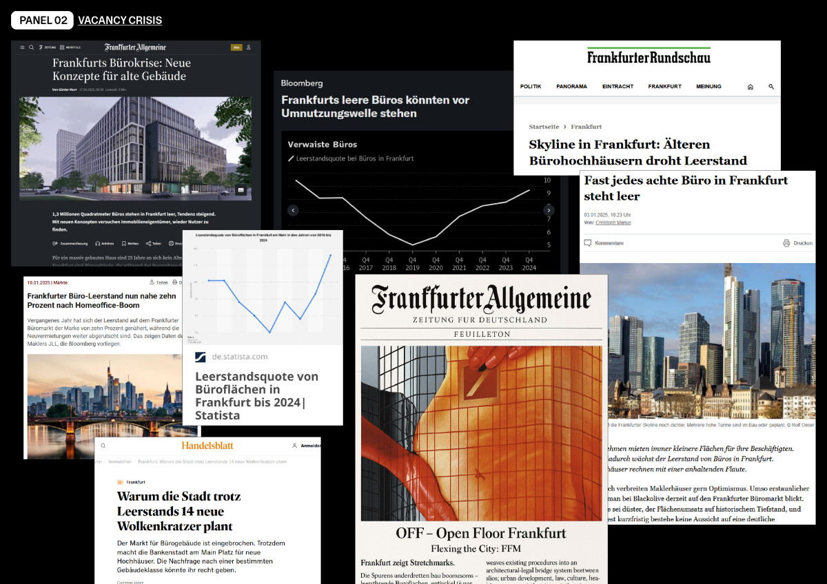Frankfurts zentrales Geschäftsviertel durchzieht ein Riss – nicht im Glas oder Beton, sondern im Denken. Riesige Wolkenkratzer stehen teilweise leer, während Seniorenheime schließen, Jugendzentren verschwinden und generationsübergreifende Dialoge verloren gehen. Leerstand bedeutet hier nicht einfach Abwesenheit, sondern Ausgrenzung. Diese leerstehenden Etagen, Nebenprodukte spekulativer Stadtentwicklung und finanzieller Hypertrophie, sind kein Versagen der Architektur, sondern der räumlichen Verteilung. Sie sind Dehnungsstreifen am Körper der neoliberalen Stadt: sichtbare Zeugnisse einer übermäßigen Ausdehnung, eines Ungleichgewichts und einer systemischen Fehlausrichtung zwischen baulichem Angebot und sozialer Nachfrage.
