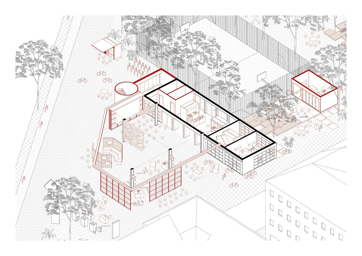 Das öffentlich zugängliche und überdachte Erdgeschoss bietet Platz für eine Gemeinschaftswerkstatt. Wo einst Zapfsäulen standen, findet man nun eine Infrastruktur zum Ausleihen von Werkzeugen, zum Aufladen von E-Bikes und zum Anschließen digitaler Geräte. In diesem urbanen Labor kommen Menschen zusammen, um gemeinsam eine nachhaltige Zukunft zu gestalten – offen, zugänglich und so sichtbar wie einst die Zapfsäulen