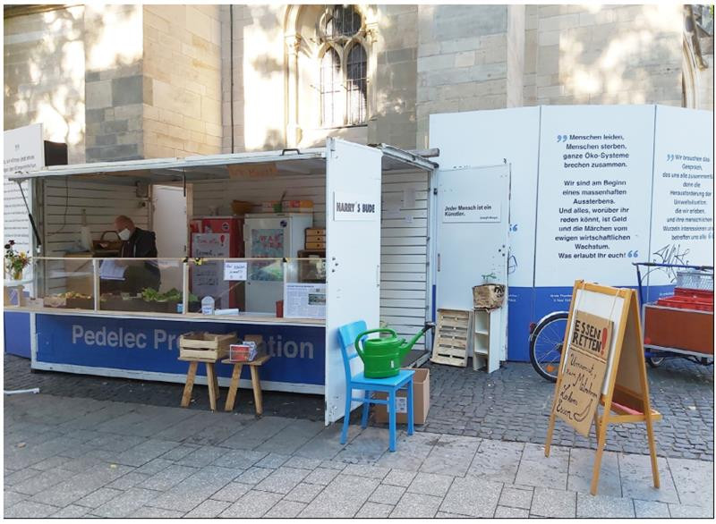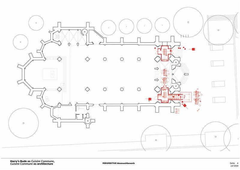 Die Stuttgart Cuisine Commune basiert buchstäblich auf dem, was vom Himmel fällt – in mehrfacher Hinsicht: Zunächst gibt es Harry’s Bude, eine temporäre Lebensmittel-Teilhabestation, die Menschen mit Essen versorgt. Die Organisation dieses Versorgungssystems ist eine schwierige Arbeit, die von vielen geleistet wird. Doch für einen kurzen Moment wollen wir sagen: Harry und seine Mitstreiter liefern Essen, das vom Himmel fällt. Dann gibt es den porösen Stein, der sich vom Gebäude gelöst hat und auf den Boden fiel – genau vor dem Ort, an dem die fragile Architektur von Harry’s Bude errichtet wurde: die St.-Maria-Kirche. Diese Steine sind der Schwerkraft erlegen, haben ihre Kohärenz verloren, sind gebrochen, gesplittert, gefallen, zertrümmert worden. Drittens gibt es die einzigartigen, handgefertigten und glasierten Dachziegel, die von einer Handwerkerin im Süden Stuttgarts gebrannt werden – fast nirgendwo sonst – und die im Französischen denselben Namen wie ein Käse tragen: La Brique. Dies ist der Ausgangspunkt unserer Idee der Stuttgart Cuisine Commune: diese drei konzeptionellen Elemente – Der Stein + Der Himmel + Die Brique. Das Wesentliche: eine Architektur für Harry’s Bude zu entwickeln, die sich in diesen Ort einfügt, sich in die Mauern einfügt, sich mit den Steinen verbindet – so, dass nichts sie infrage stellen kann. Gleichzeitig soll eine Struktur geschaffen werden, die nicht nur die Verteilung von Lebensmitteln ermöglicht, sondern auch ausreichend Platz, Lagerkapazität, Kühlmöglichkeiten und Raum für gemeinsames Kochen bietet. Es ist der Traum eines großzügigen, offenen und pragmatischen Ortes. Die Steine erinnern uns an Walter Benjamins Konzept der Porosität, das wir auf die Situation von Harry’s temporärer Hütte und der Kirche als Institution anwenden wollen. Das Projekt „Harry’s Bude als Commune-Küche – Commune-Küche als Architektur“ zielt darauf ab, das Kirchengebäude durchlässig, zugänglich, offen und aufnahmefähig für seine unmittelbare Umgebung zu machen: Harry’s Bude und den Österreichischen Platz. Es geht darum, Momente der Porosität in feste Strukturen zu integrieren und Architektur als eine Praxis der Intervention zu begreifen – eine Geste der Öffnung, des Teilens, der Gleichzeitigkeit und der Versammlung. Gerade weil sich in unserer Gestaltung etwas manifestiert, bleibt es entscheidend, nicht aus den Augen zu verlieren, was die Hütte und Benjamins Konzept ausmacht: „Man vermeidet das Abgestempelte, keine Situation erscheint so, als sei sie für immer gedacht, keine Form behauptet ihr ‚So und nicht anders‘. Denn nichts ist abgeschlossen oder vollendet.“ Die Stuttgart Cuisine Commune schafft eine Durchlässigkeit für verschiedene Handlungsspielräume und versteht die Küche als offenen Raum und Werkstatt, in der durch ko-produktive Prozesse ein lebendiger Ort entsteht. Dies bedeutet in der Praxis – wo, mit Stefano Harney und Fred Moten, ‚die Planenden noch immer Teil des Plans sind‘ – ‚die Mittel in einem gemeinsamen Experiment zu erfinden, das in jeder Küche […], in jedem Korridor, auf jeder Parkbank […], die Ankunft von Lebensformen auslöst […].‘ Das ist der Traum: das Erproben gemeinschaftlichen Handelns – als Küche – an diesem Ort.*