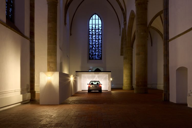 Und schließlich die Einzelausstellung On the Street Where You Live von Steve Bishop in Osnabrück. Das in einer ehemaligen Kirche geschaffene Bild einer Vorstadtszene – ein vor einer Garage geparktes Auto, aus dem Jazzmusik ertönt, der vertraute und gleichsam seltsame Geruch einer Tiefkühltruhe, Fotos von der Familie in Disneyland, Lichter, die uns wie Wachen überall hin verfolgen. Es wirkt wie ein Requiem der Unschuld, eine Erinnerung an den Moment, in dem die tröstliche Illusion der Kindheit zerplatzt und uns mit den ungeordneten Widersprüchen des Erwachsenseins konfrontiert. In Bezug auf unsere Reise fühlte sich dies an wie ein bittersüßes Echo: das unmögliche Gleichgewicht zwischen dem Glauben an das, was wir tun, und dem Navigieren durch die Desillusionierung.