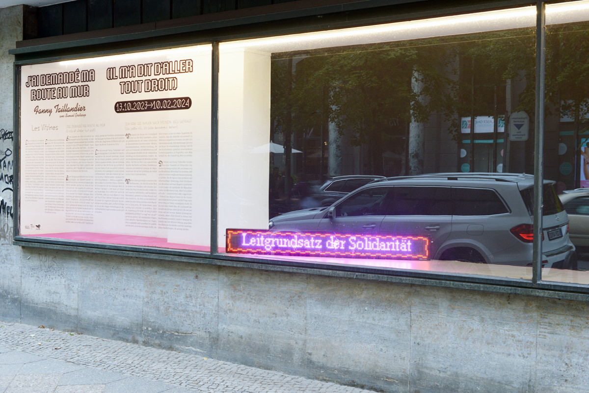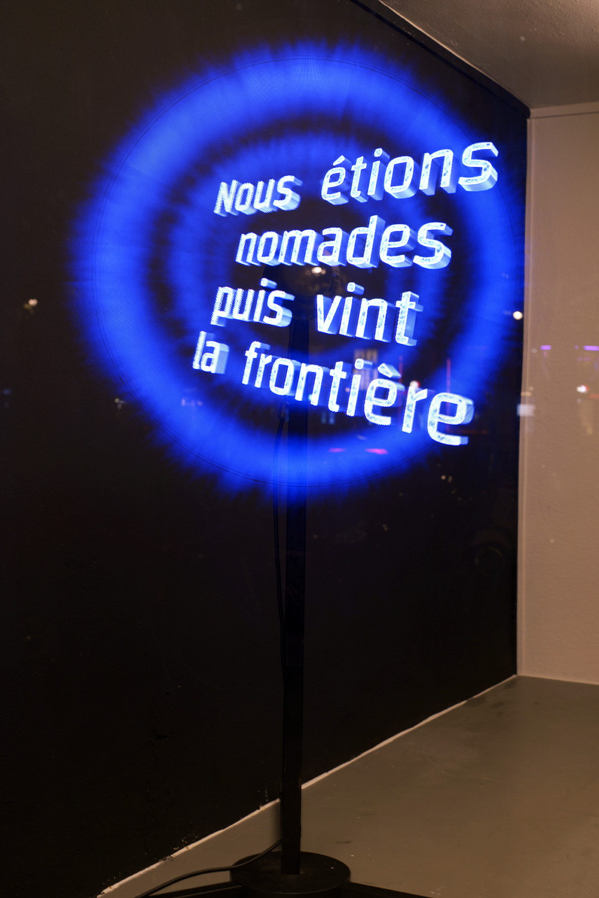 Besteht etwa die Gefahr, dass uns die Wörter, die im juristischen Fachjargon so geordnet daherkommen, entgleiten und sich gegen uns richten, wie die Maschinen in der Science-Fiction? Oder können wir noch auf die Menschheit setzen? Die Installation J’AI DEMANDÉ MA ROUTE AU MUR (il m’a dit d’aller tout droit) stößt einen Reflexionsprozess an, ergänzt durch die Fotos von Samuel Gratacap, die der Grenze als durchstreiftem, erlebtem und nicht erst durch den Diskurs errichtetem Raum ein Gesicht geben.