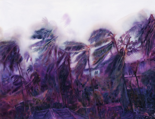 Während der Recherchereise nach Berlin treffe ich erneut Katharina Ziemke, die mir die Kuratierung ihrer Ausstellung Unwetter anbietet. Zwischen Darstellung und Abstraktion, Traum und Realität beleuchtet der Werkkorpus Unwetter auf der ganzen Welt. Die mit Öl oder Tusche auf Reispapier gemalten Werke fangen die erhabene Schönheit und zerstöre-rische Kraft des Sturms ein und nutzen die Möglichkeiten des Mediums, intensive, gefühlsbetonte Farben und Texturen zu vermitteln.