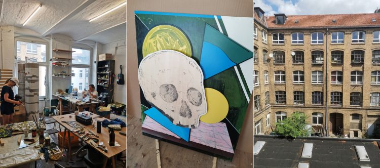 Am Samstag, den 18. Juli, treffen wir uns mit Mathias Schech in seinem Studio im Herzen von Neukölln, gegenüber dem großen Hasenheide-Park. In einem Hinterhof, umgeben von alten Ziegelfabriken, finden wir sein Studio im vierten Stock. In einem Raum, den er sich mit drei anderen Künstlern teilt, hat Mathias dennoch genug Platz, um seine Gemälde zu schaffen, die durch ihre reliefartigen Elemente erkennbar sind. Vielen Dank, Mathias, für dieses schöne Treffen!