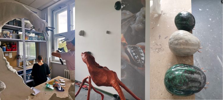 Am Freitag, den 21. August, bei einer extrem heißen Tageshitze treffen wir Adrien in seinem Atelier an der Grenze zwischen den Stadtteilen Kreuzberg und Neukölln. In einem zweiten Hinterhof eines Gebäudes finden wir einen ehemaligen Stall, der in Künstlerateliers umgewandelt wurde, darunter auch Adrien’s Atelier. Dort verbrachten wir den Vormittag und sprachen unter anderem über Kakteen, Ozeane und Dinosaurierkot.