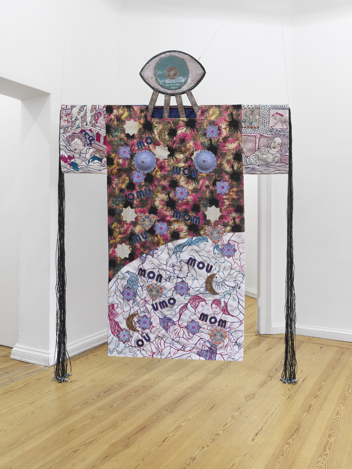 Nadira Husain, Giant, Big Eye, 2024. Acrylfarbe auf Leinwand, vernähte Textilien und handbemalte, glasierte Keramik, 280 x 210 x 10 cm, Courtesy Nadira Husain / PSM Gallery Berlin