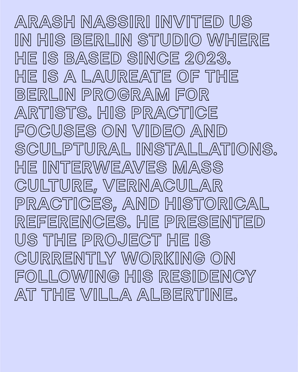 Arash Nassiri (b. 1986, Tehran, Iran) is a laureate of the Berlin Program for Artists and has been based since 2023. Focusing on video and sculptural installations, he interweaves mass culture, vernacular practices, and historical references.