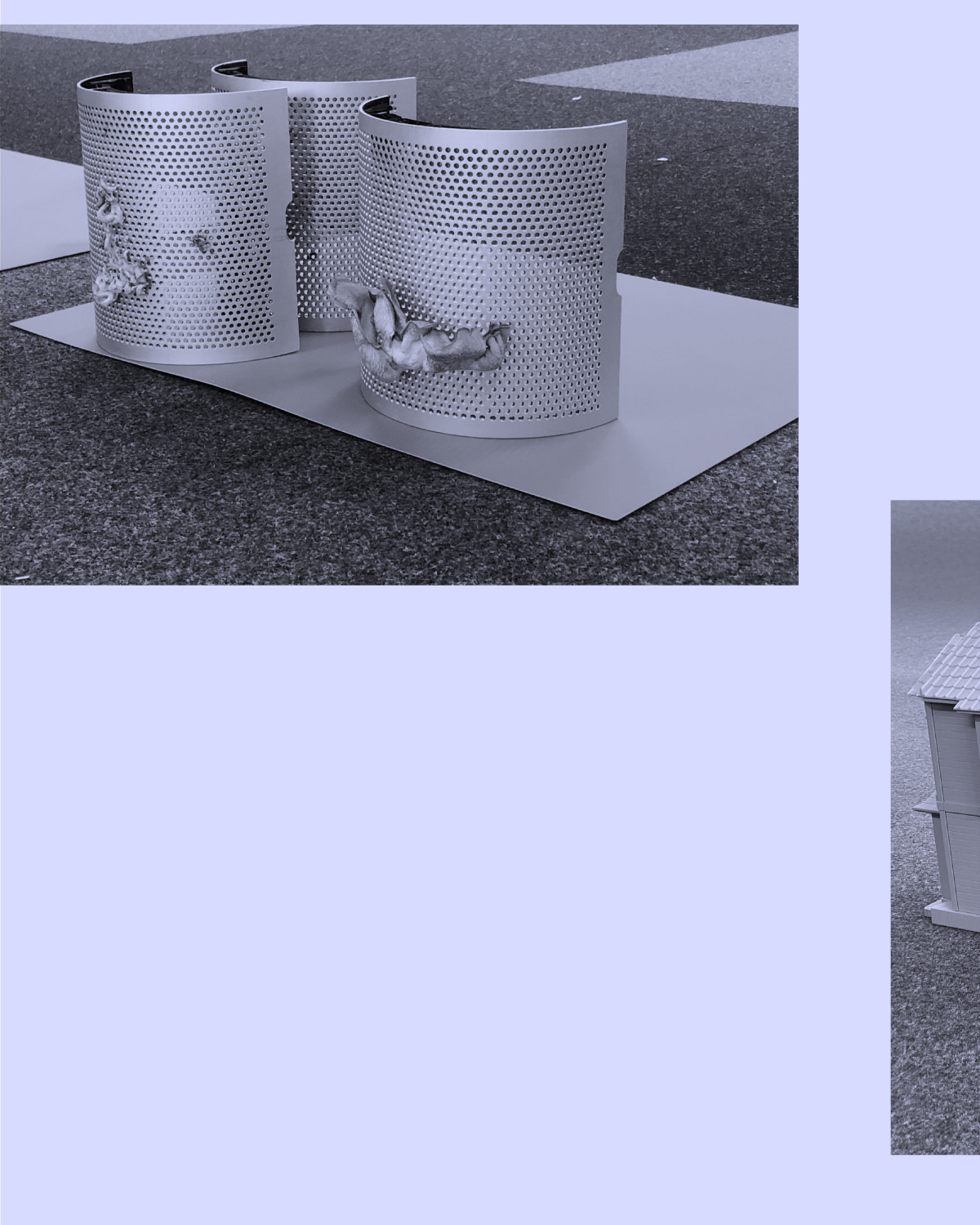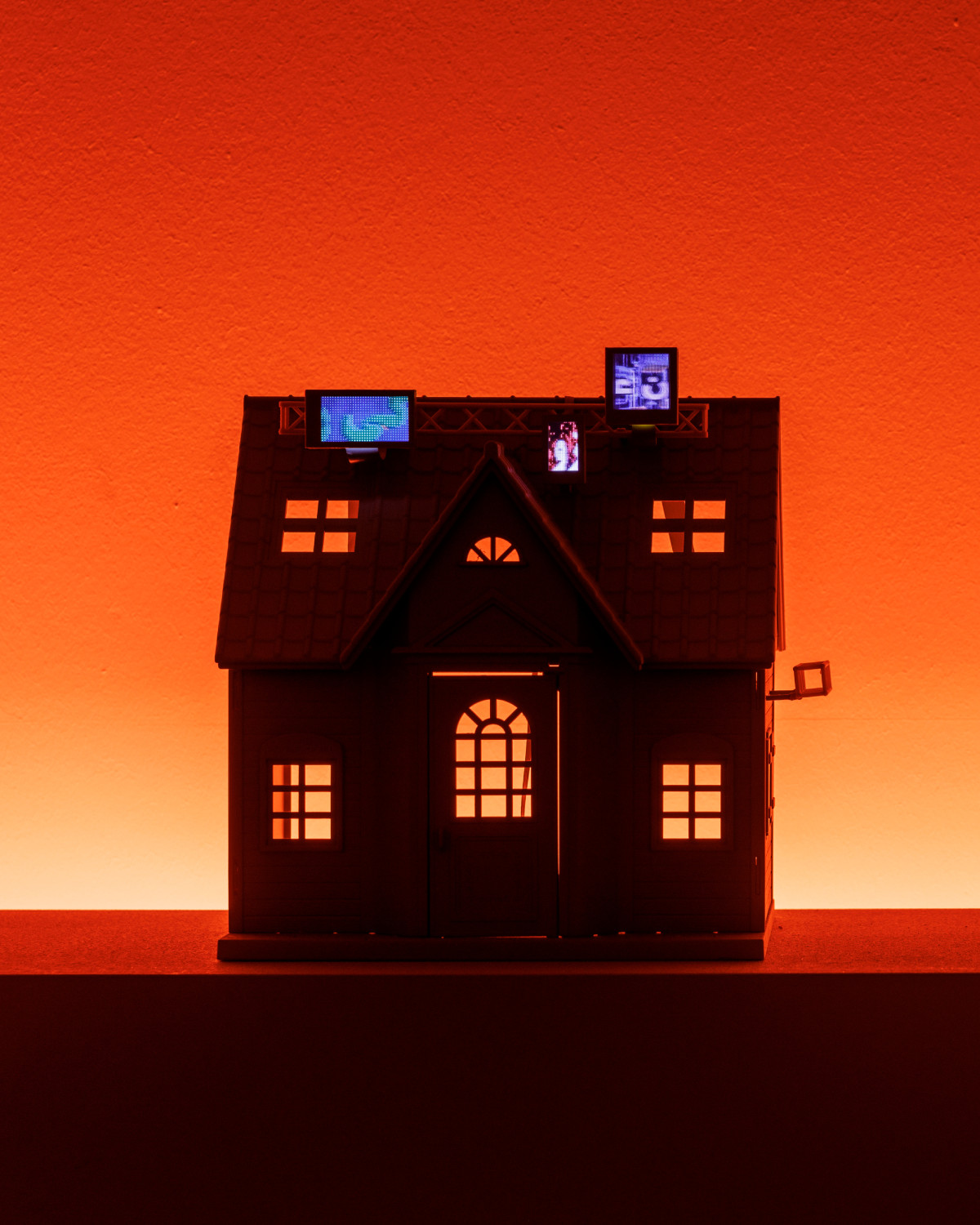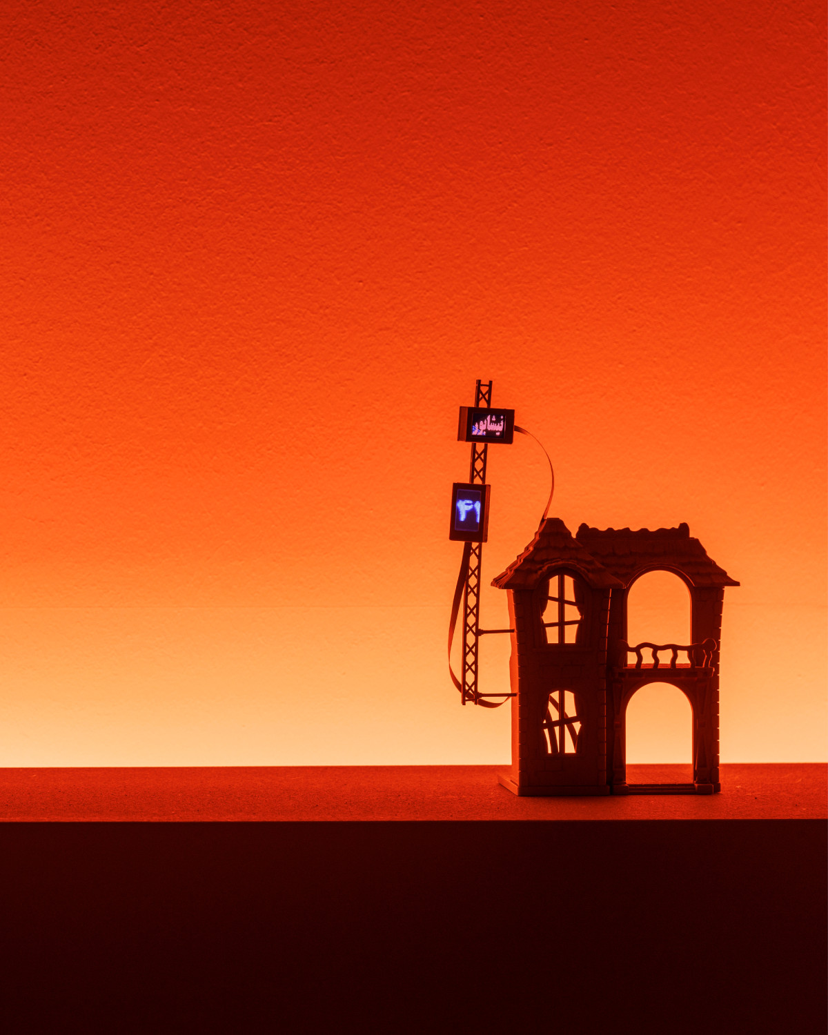 The artist's studio also houses the installation ‘Untitled’, presented as part of the Berlin Programme for Artists (BPA) 2024 exhibition, which uses Sylvanians dollhouses, whose design mimics the style of English cottages, even though they are manufactured and distributed by a Japanese toy brand. These tiny doll houses are transformed into ghostly scale models. On the facades, miniature replicas of LED animation panels relay advertising messages in Persian. Here, Nassiri highlights this Iranian popular practice that develops its own visual language. By displacing these fragments of the Tehran nightscape into an art space, he introduces junk imagery that is intended to be of low quality in the setting of an institution where the public gaze must evaluate the quality of the works. What emerges is a dialogue between heterogeneous spheres: the memorial landscape of childhood, the visual code of advertising, and the discursive space of global contemporary art.