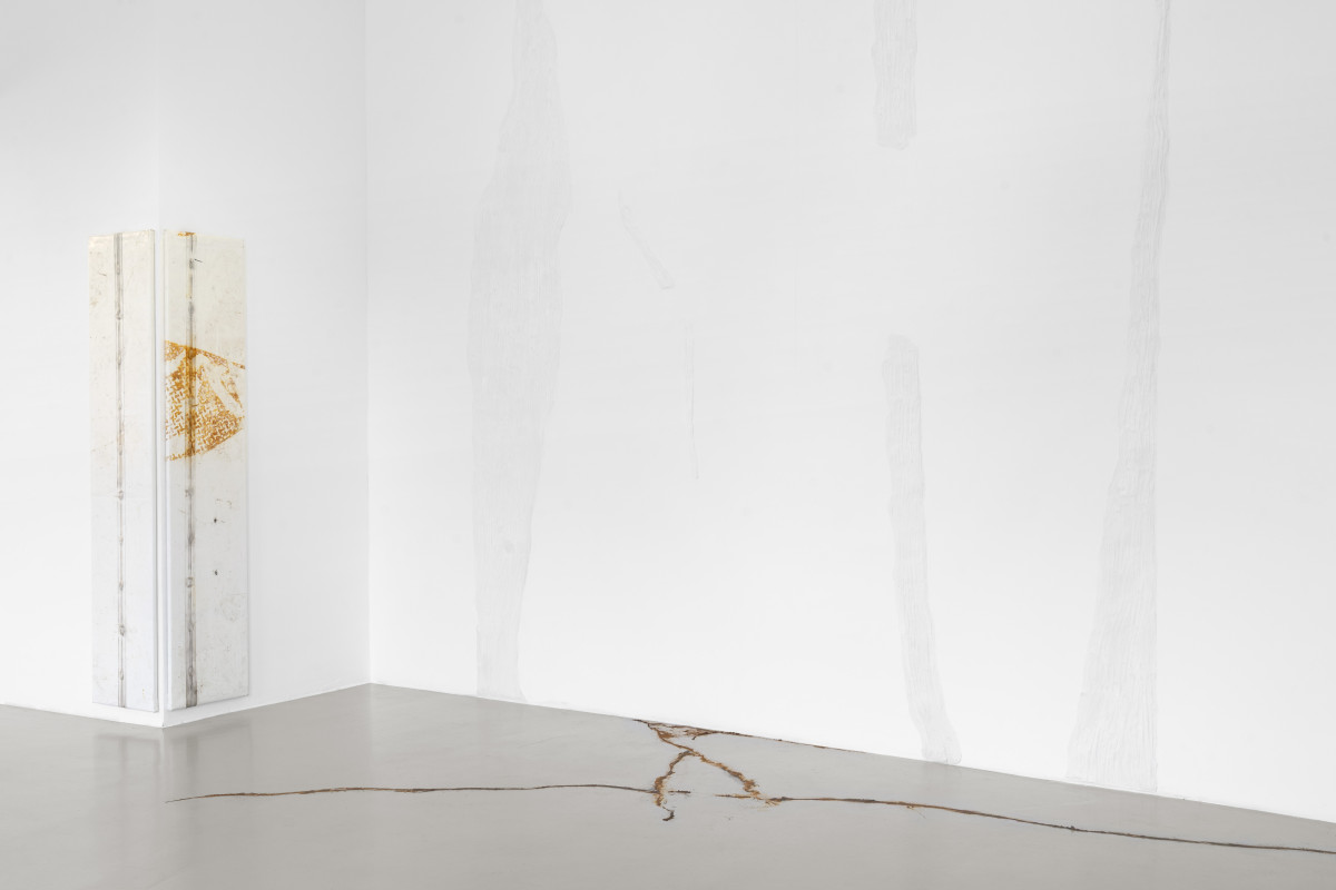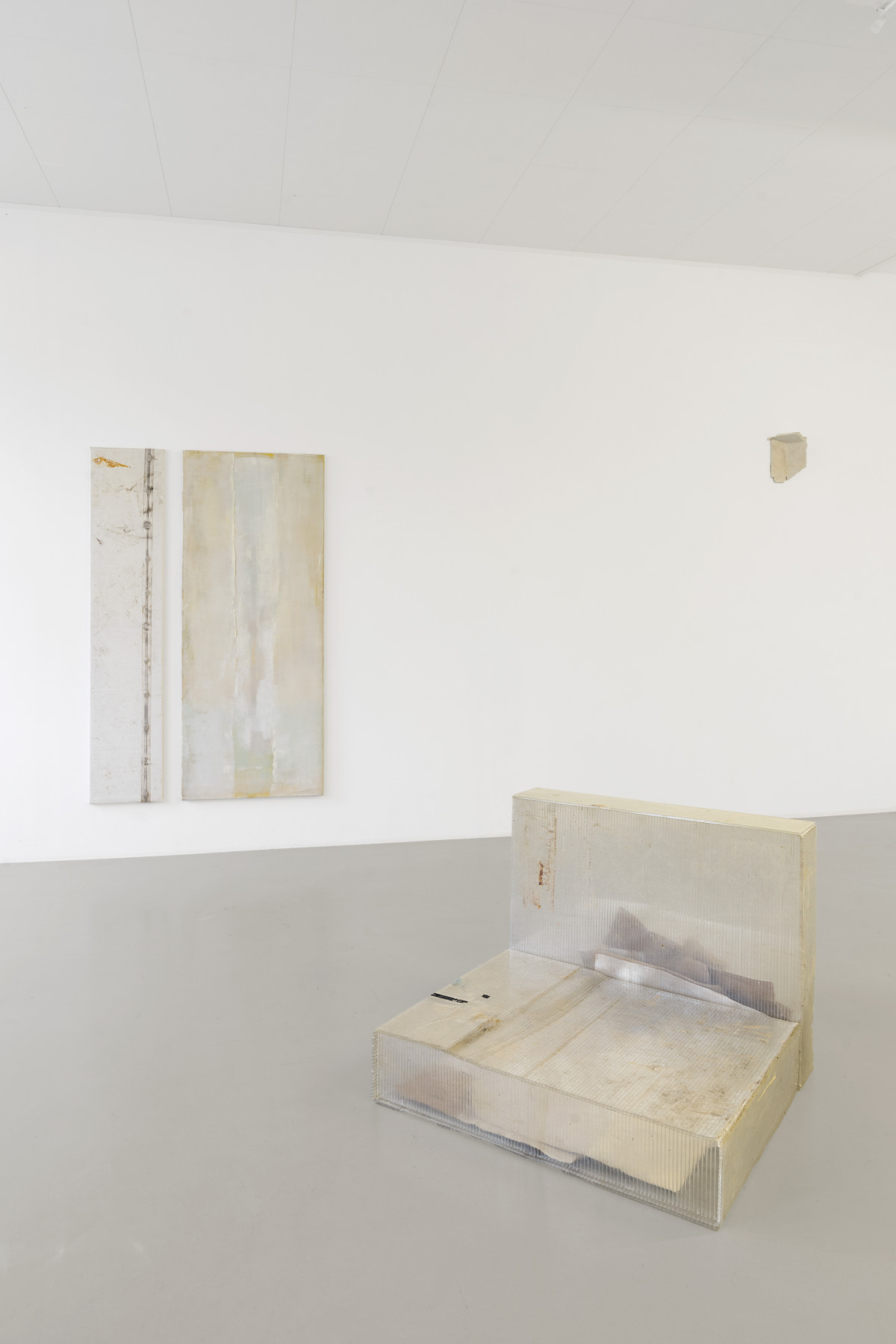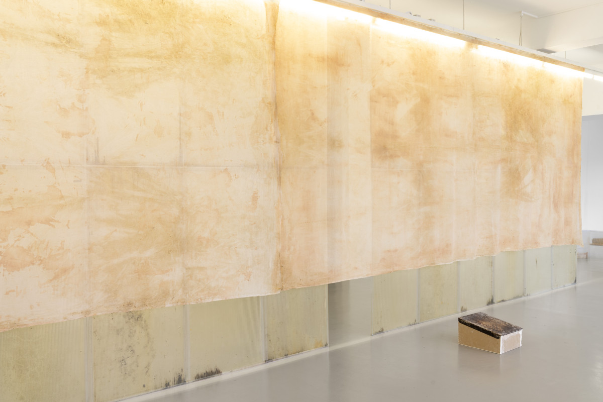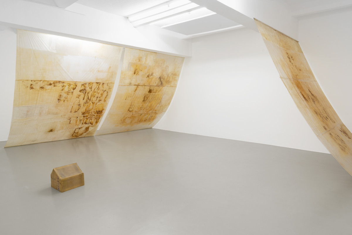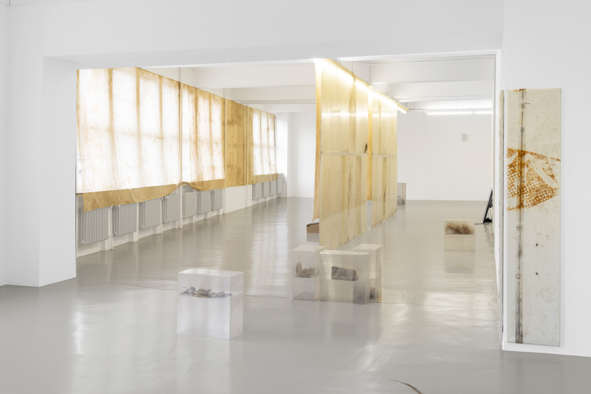 Le tissu sur lequel sont réalisées certaines des œuvres présentées dans l'exposition restera un certain temps sur les rives de la Weser, influencé et façonné par le rythme du fleuve. La peinture que Weiss applique sur le tissu avant et après son contact avec l'eau relie entre eux différentes temporalités, des influences humaines et plus qu'humaines, ainsi que le bâtiment.