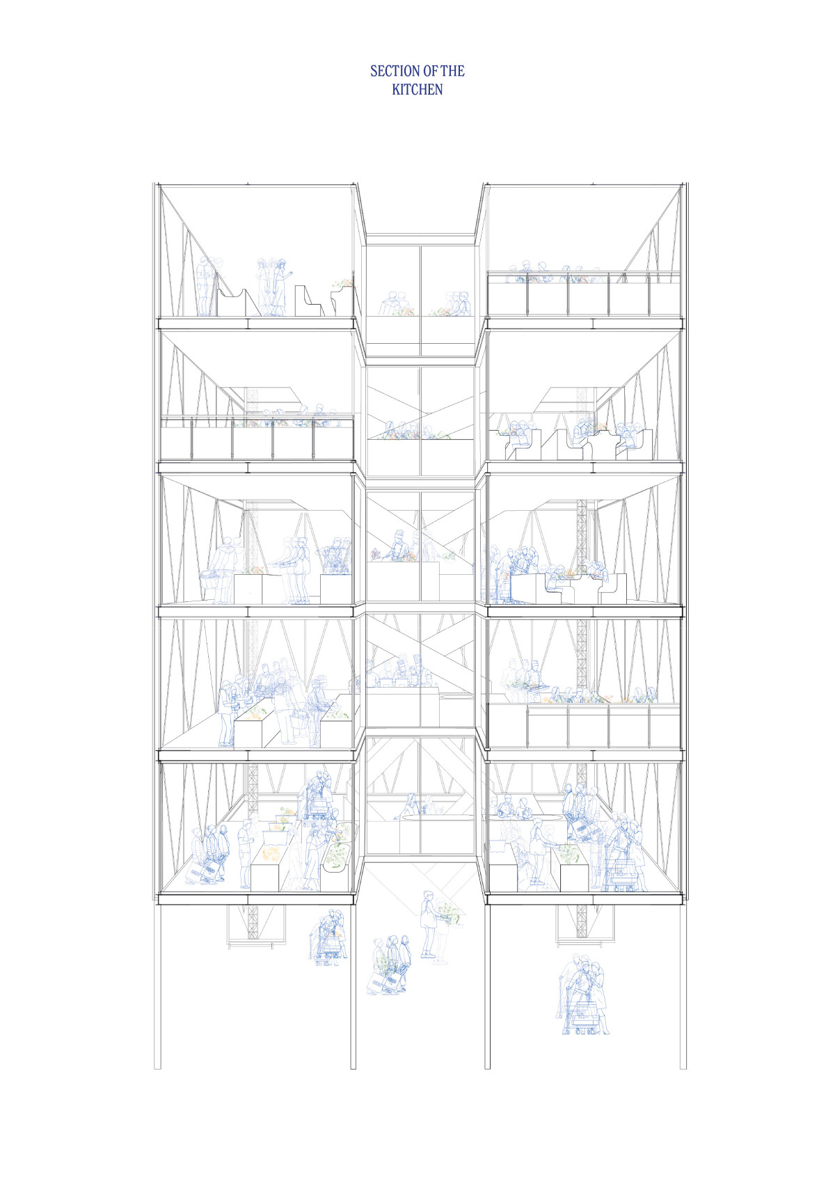 Like the structure of the market, which folds and unfolds, the architecture of the kitchen shrinks, grows and adapts according to the amount of waste recovered, creating a scenographic and educational dimension to the act of cooking with waste. It’s a system that unfolds in the city in a totemic way. Like a newsagent or a fountain, our architecture tends to become a visual and identifiable element in the city. The market is no longer an ephemeral space; the grafting of the kitchen redefines the temporality of the market. Our kitchen is a set of levels that perform several functions: sorting, cleaning, cooking, eating and washing. The plan is built around a system, which is put in place by a need for highly predictable equipment (storage, sorting, cleaning, cooling, etc.). The access, goods lifts, storage areas, water container and compost areas are positioned on the façade, in a double skin, to showcase the resources from the street.
