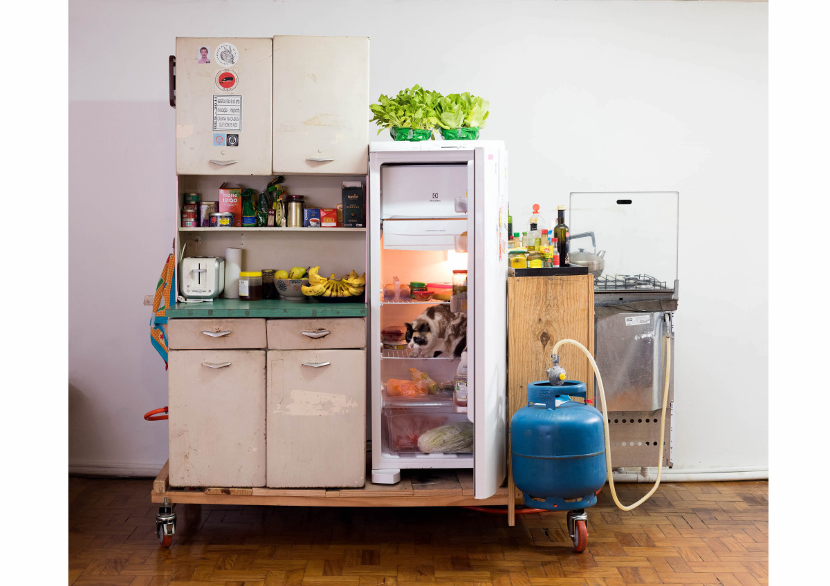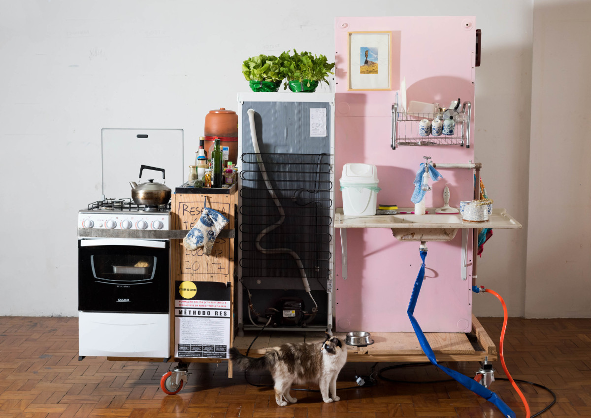 Of course, we have functional answers to these questions, but if we create space for a poetic vision of uses, we open up endless possibilities that lead us to more interesting, fun, and potential-filled places. With this spirit in mind, the idea of the lobster kitchen emerges. Built entirely with common elements of a cheap kitchen – a simple refrigerator, a four-burner gas stove, an old cupboard, and a sink – it refuses to follow the “expected layout.”