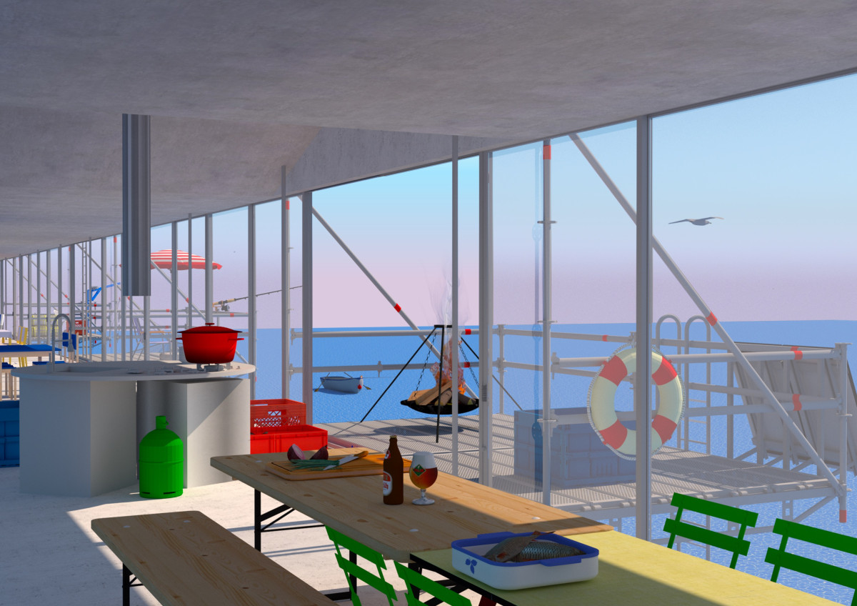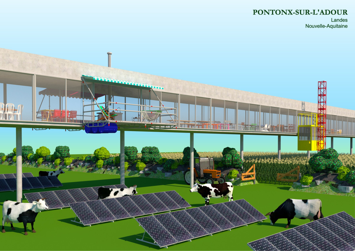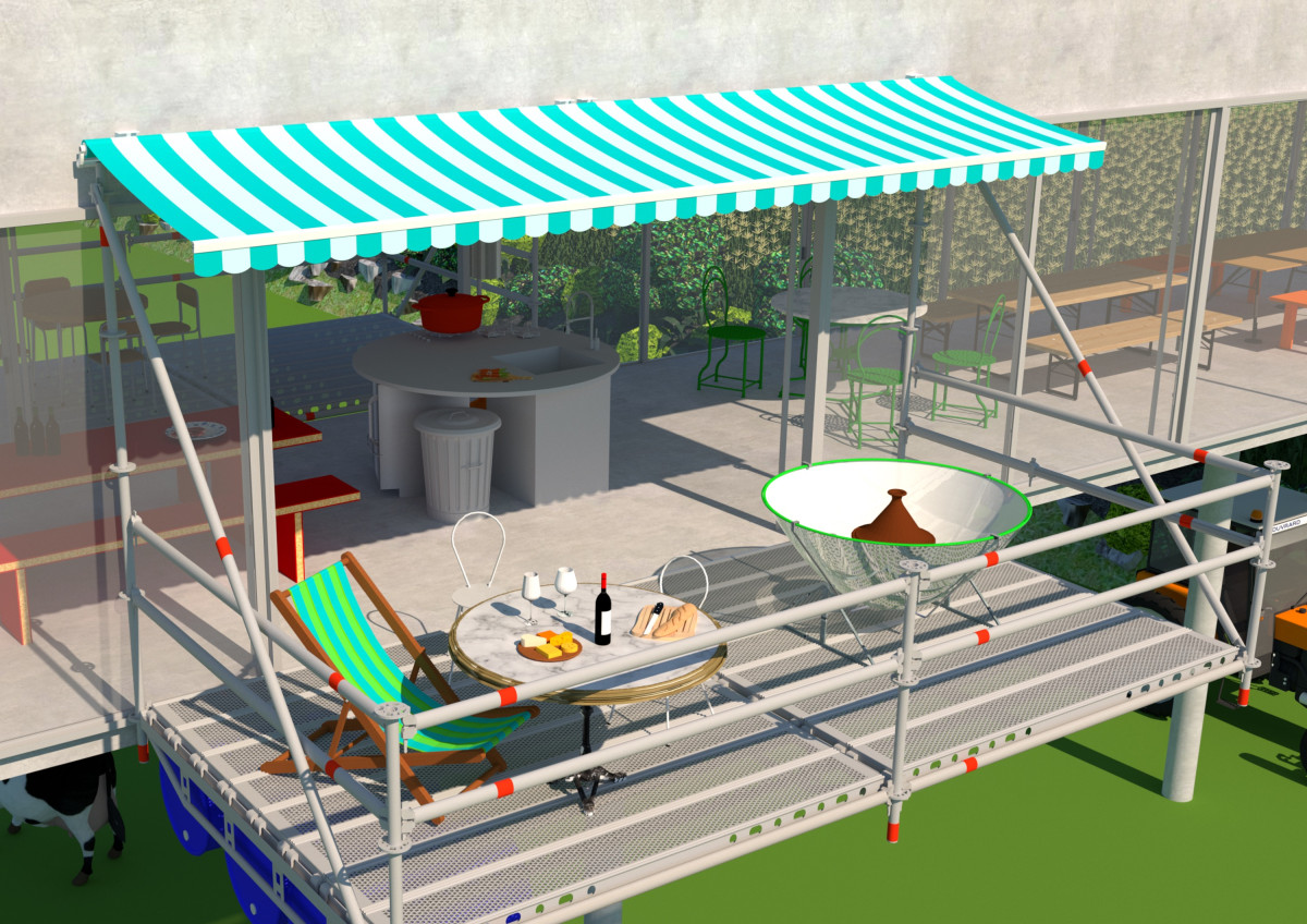 Gastrobahn est un projet à grande échelle conçu pour approvisionner, cuisiner et servir les repas nécessaires aux 8,5 millions d'Allemands et de Français souffrant d'insécurité alimentaire. Gastrobahn traverse des régions allemandes et françaises aux caractéristiques sociales, géologiques et météorologiques très différentes. Cette structure concrète est divisée en 4 parties : Les piliers, qui minimisent l'impact sur les environnements traversés par Gastrobahn et la rendent adaptable à tous types de géographies. La zone centrale de préparation et de dégustation, longue de 1 760 km. Un espace clos et couvert ponctué d'îles de cuisine partagées. Tout au long des 1 760 km, des tables de seconde main provenant de brocantes sont disposées pour servir la nourriture. Les balcons flexibles et modulaires permettent d'agrandir l'espace central à volonté, l'ouvrant sur le monde extérieur. L'auto-installation de ces structures semblables à des échafaudages permet de se rassembler, de préparer, de goûter et de digérer un bon repas en plein air sur Gastrobahn. Le toit, véritable autoroute à vélos, permet la circulation des produits alimentaires locaux, encourageant les achats responsables et les circuits courts. Structure autonome capable de s'adapter à différentes situations, Gastrobahn est une réponse à la crise de l'insécurité alimentaire en Allemagne et en France, mais c'est aussi une organisation qui valorise les territoires locaux et la relation entre les deux pays. Autonome en énergie grâce à des systèmes de récupération d'eau low-tech, des éoliennes domestiques, des fours et des panneaux solaires, Gastrobahn génère sa propre énergie pour la préparation et la cuisson des repas. Gastrobahn est un lieu convivial où chacun peut partager un repas ensemble, créant des liens sociaux et défendant l'une des valeurs fondamentales de la cuisine : le partage.