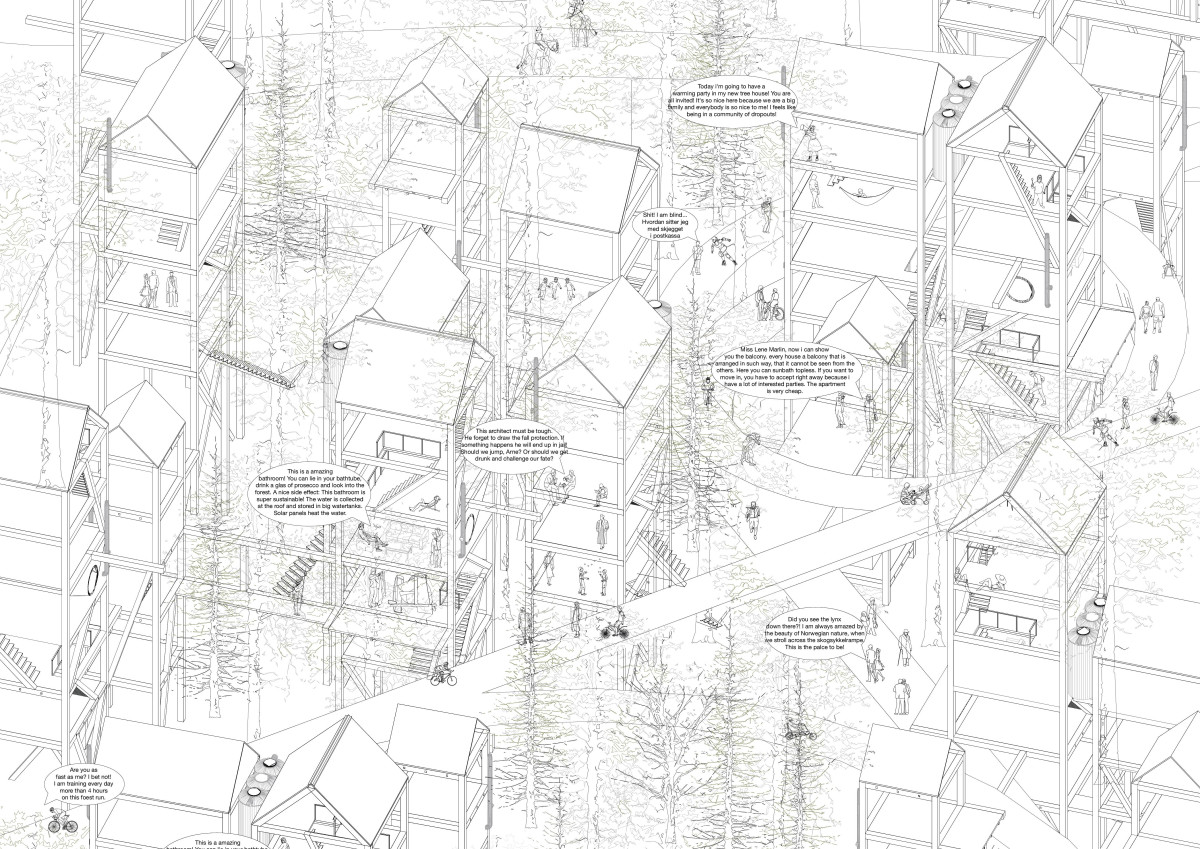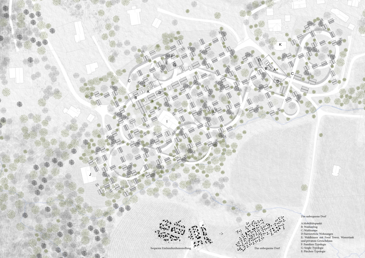Here, nothing reminds me of my adventurous childhood in the forest and I decided to build my own little village. The uncomfortable village counters the debate about climate protection and comfort. Instead of more and more standards, technology and a social renunciation debate, the inconvenient village shows that lowering our requirements and returning to a simple and reduced living environment is by no means a loss of quality, but rather puts long-forgotten qualities of life back into the focus of our living and thus creates social, ecological and health-related added value. Instead of dreary, barren single-family homes, an adventurous living typology in harmony with nature and wildlife is created.