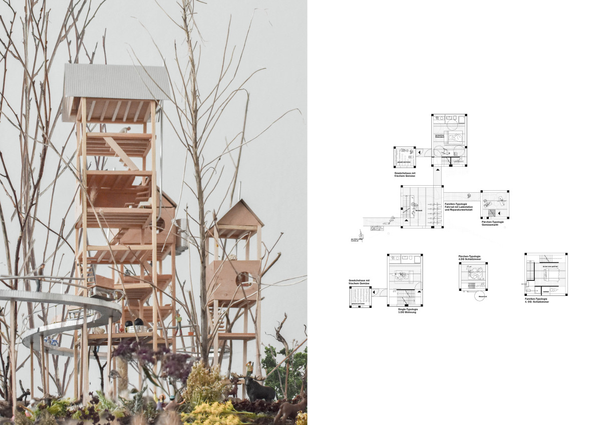 As a rule, forests are cut down when new settlement areas are designated, which leads to urban sprawl and environmental destruction. The habitat of animals shrinks, biotopes are destroyed and valuable forests are lost. Building often represents a conflict between humans and animals. But we want to change that and propose to rethink the relationship between humans and animals. Our project looks at solidarity with animals in human spaces and proposes a new way of living together: Animals and plants conserve the ground, while humans live one level higher. Single-family homes consume a lot of land, building materials and energy, leading to even more traffic, expensive infrastructure and further loss of biodiversity.