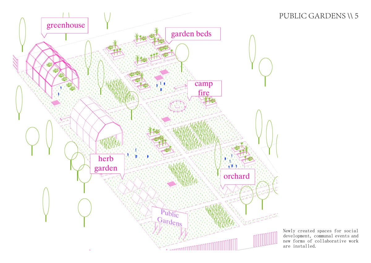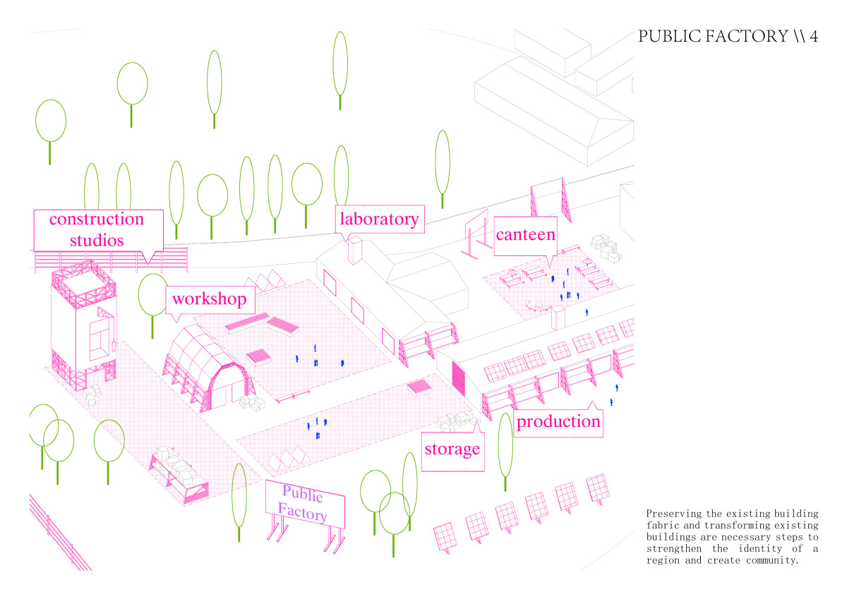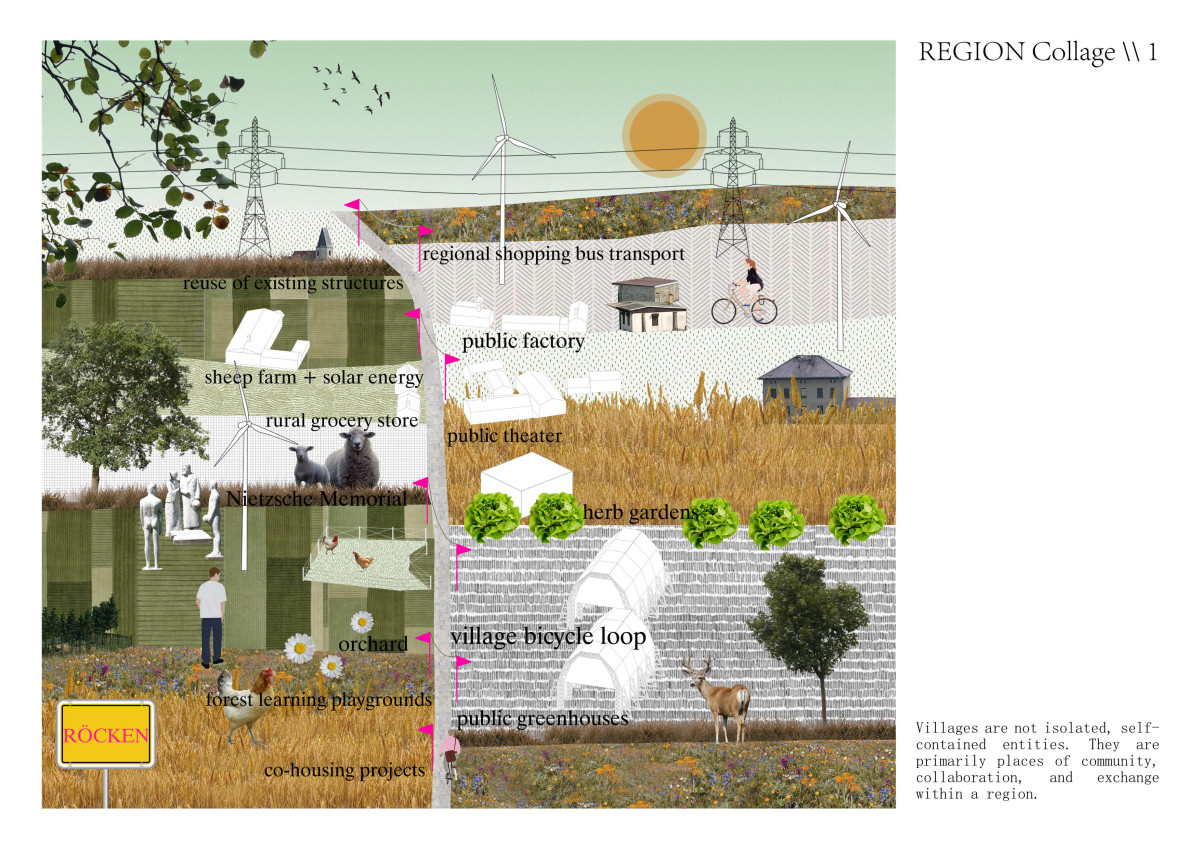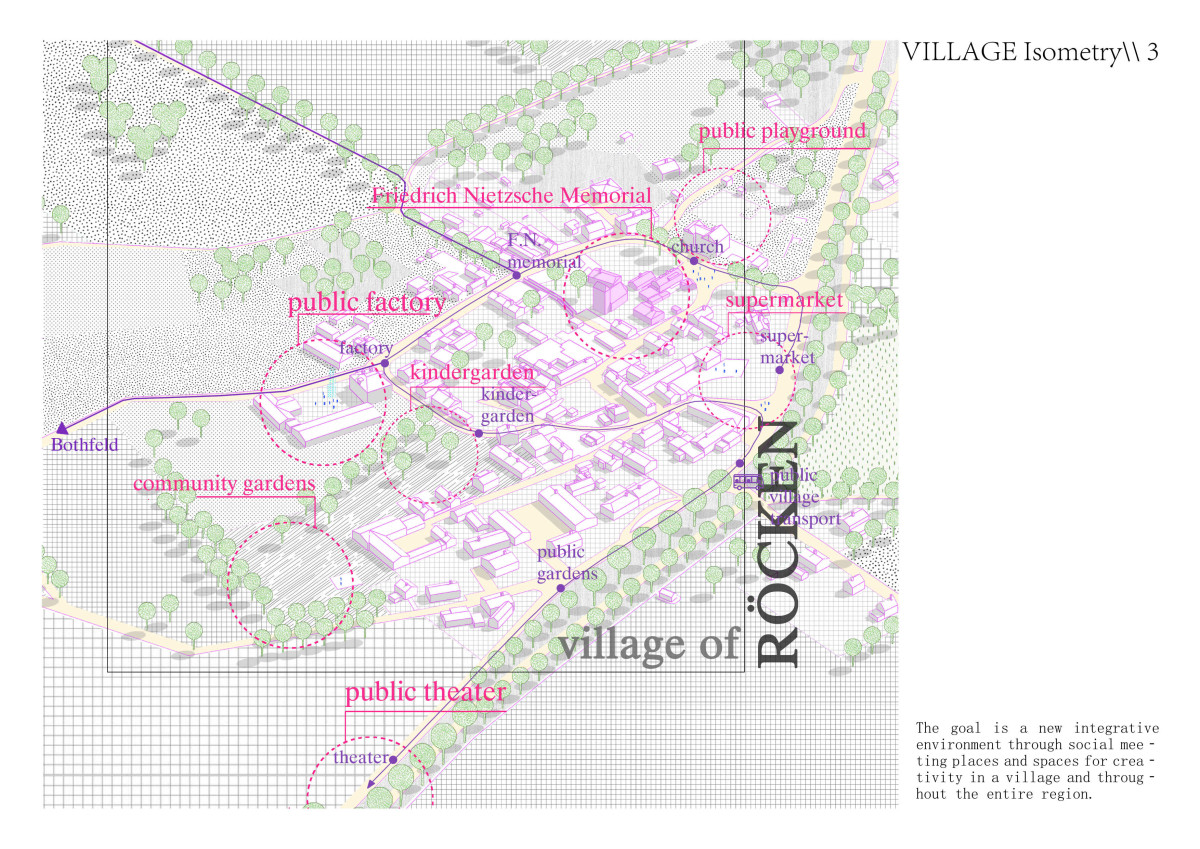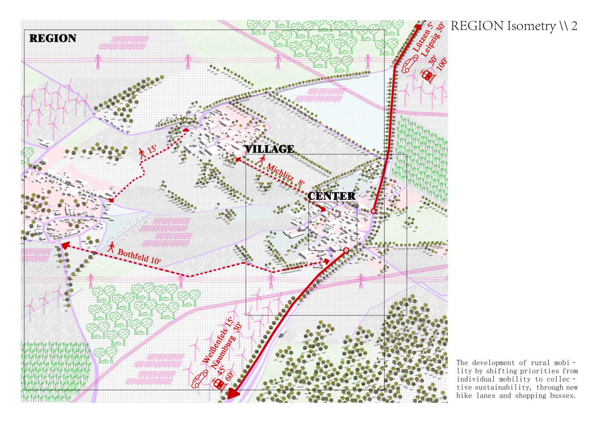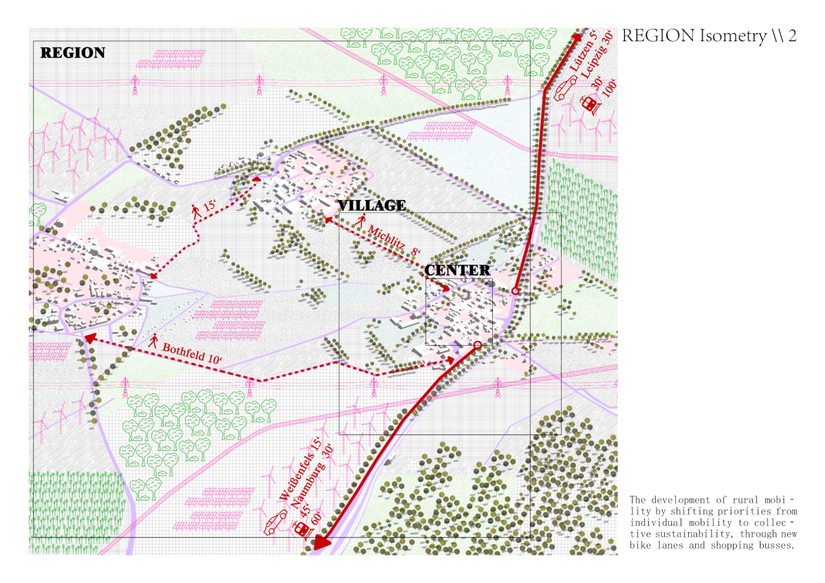 Preserving the existing building fabric and transforming existing buildings are necessary steps to strengthen the identity of a region and create places for community development. For example, in the village of Röcken, near Lützen in Saxony-Anhalt, there is the creation of a Public Factory, Public Gardens, and the conversion of an abandoned gravel pit into a public theater and cinema. These are newly created spaces for social development, communal events, and new forms of collaborative work. The goal is a new integrative environment through social meeting places and creative spaces throughout the entire region and the creation of opportunities for active appropriation of spaces by society. Alongside this is the development of rural mobility by shifting priorities from individual mobility to collective sustainability, through measures such as new bike lanes, local shopping buses, and new pedestrian networks.