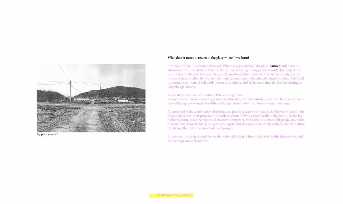 The place, where I was born and raised. Where my parents live. The place ‘Gunsan’ still remains strong on my mind. At the end of my studies, I had a feeling do my personal work. The project area is my father's old cattle house in Gunsan.