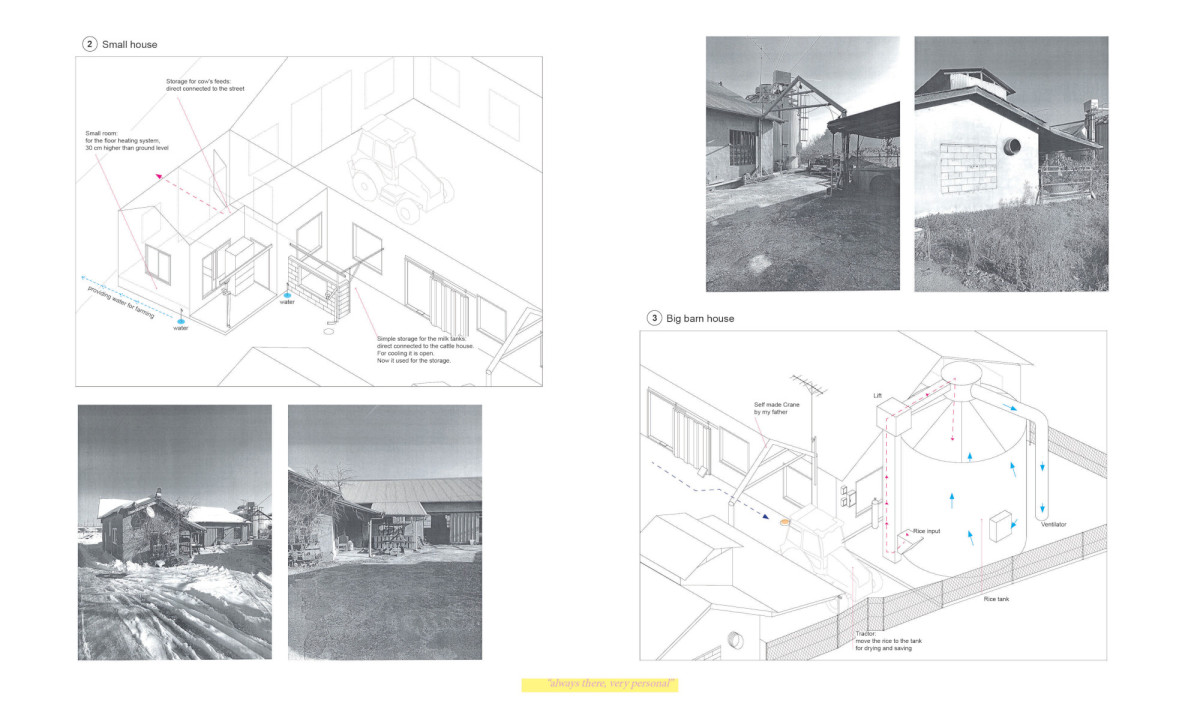 The old cattle house consists of two houses. It is located at the edge of my town so it faces to directly the rice fields and surrounded by abandoned natural situation. I decided to return to my home. I will work here as an architect, and at the same time make the rice farming to keep the