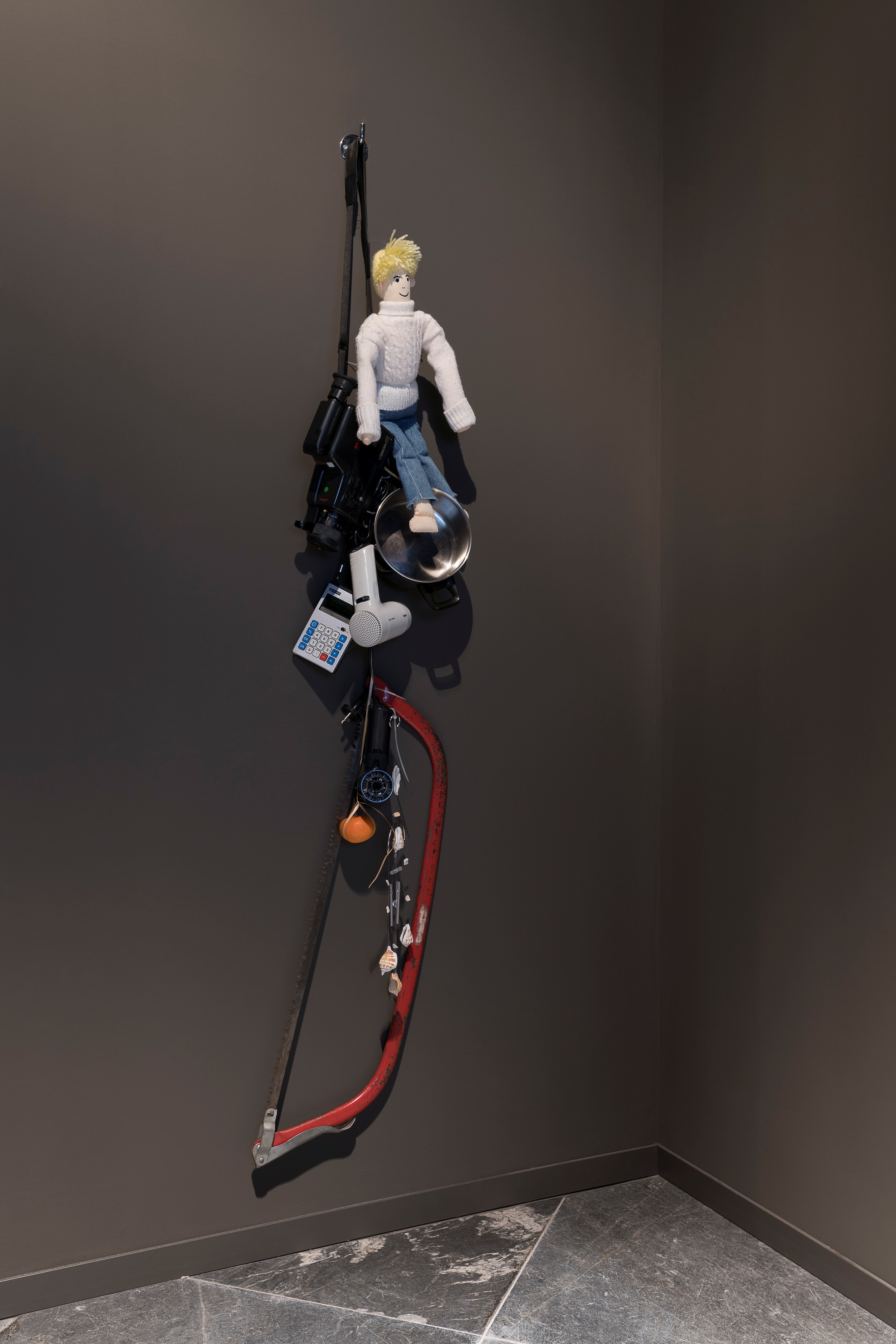 J’y découvre le travail de Phung-Tien Phan, artiste vietnamienne et allemande née en 1983, qui vit et travaille à Essen. Elle y présente deux œuvres : Tragic Triangle Trip (2022), une vidéo, et Tom Minimal, une sculpture faite d’une poupée, d’une caméra, d’une calculette, d’une casserole, d’une scie, d’un sèche-cheveux, d’un téléphone et de clémentines. Un assemblage à la fois accidentel et intentionnel, qui fait écho à la vidéo — comme deux formes d’un même geste.
