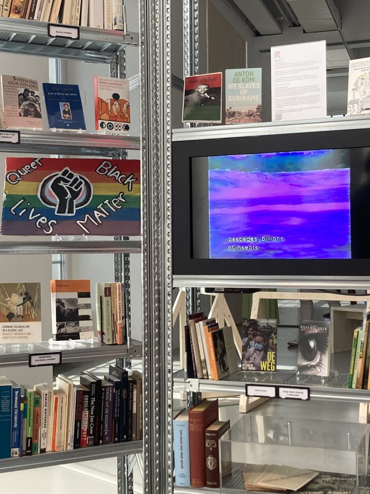 Près d’une décennie plus tard, ruangrupa, collectif indonésien invité à curater la 15e édition de la documenta, poursuit cette volonté d’inclure la production éditoriale au sein des propositions artistiques, en conviant plusieurs collectifs dont les pratiques ont trait à l’archive et à la publication, et en concevant par exemple un « lumbung of publishers », réseau informel de partage de ressources. En effet, cette 15e édition n’a volontairement pas été conçue autour d’une inscription thématique, mais davantage comme une observation des méthodes actuelles de collaboration, d’auto-organisation, de processus, d’apprentissage critique, d’expérimentation et de partage, défendant notamment une lecture non-occidentale, anti-impéraliste et décoloniale du monde. Dans un enjeu de revisiter, de réinterpréter, de tordre ou de démanteler les récits dominants, il est intéressant d’observer particulièrement les propositions de cette documenta liées au médium du livre. Une manière de questionner comment combler certains vides, amplifier certaines voix, et proposer de nouvelles généalogies, qu’elles soient posées comme éminemment critiques ou dans un désir de réparation. Car si le geste de constituer une bibliothèque est l’un des plus anciens – dans une sorte de vain dessein de totaliser et classifier les savoirs du monde, ou tout du moins, d’un monde –, force est de constater que la bibliothèque peut se faire l’extension d’une historiographie officielle et dominante, ou au contraire, proposer un récit plus subversif et militant. Chaque bibliothèque est ainsi à lire dans ses pleins, ses vides et ses déliés, ses manques pouvant peut-être être aussi éloquents que les éléments la composant. Comme l’écrit Laura Larson, « comme toute structure hiérarchique, la bibliothèque est un site vulnérable, prête à être percée, démantelée, et reconstruite1».
