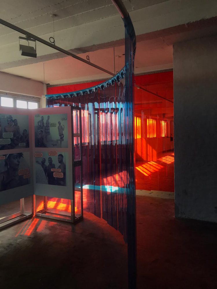 Ruangrupa a notamment formulé une invitation au collectif Fehras Publishing Practices, qui travaille sur une nouvelle historiographie artistique générée par la production éditoriale en langue arabe, à travers plusieurs zones géographiques (entre la Méditerranée, l’Afrique du Nord et la diaspora arabe). Fondé en 2015 à Berlin, Fehras a travaillé à partir de différents médiums, tels que l’archive, le livre mais aussi la bibliothèque, abordant des questions d’identités, de genre, de migrations et de dominations. Leur projet Series of Disappearances s’intéresse par exemple aux bibliothèques personnelles de différent·es intellectuel·les, auteur·rices ou éditeur·ices, en observant comment celles-ci subissent des mécanismes de déplacement, de re-localisation, de contextualisation ou de disparition. Dans leur travail, le livre et la bibliothèque apparaissent comme potentiels vecteurs par lesquels prendre le pouls d’un monde en perpétuelle reconfiguration, comme perméables aux idéologies, aux conflits et aux hégémonies, autant que comme réseaux ou flux de collaboration, d’amour et de résistance. Pour la documenta, Fehras a investi avec Borrowed Faces la forme du roman-photo, genre typique de l’époque de la Guerre Froide, époque que le projet désire explorer en prenant l’angle des pratiques féministes qui s’exerçaient à l’époque dans le monde de l’édition. Déployé sur un ensemble de panneaux dans une scénographie qui devient presque labyrinthique, le roman-photo quitte l’espace du livre pour prendre tout l’espace ; non dénuée d’humour, la proposition interchange les rôles entre éditeurs et personnages, et fait recours à la fiction comme moyens de « queeriser » le récit et d’hybrider le genre.