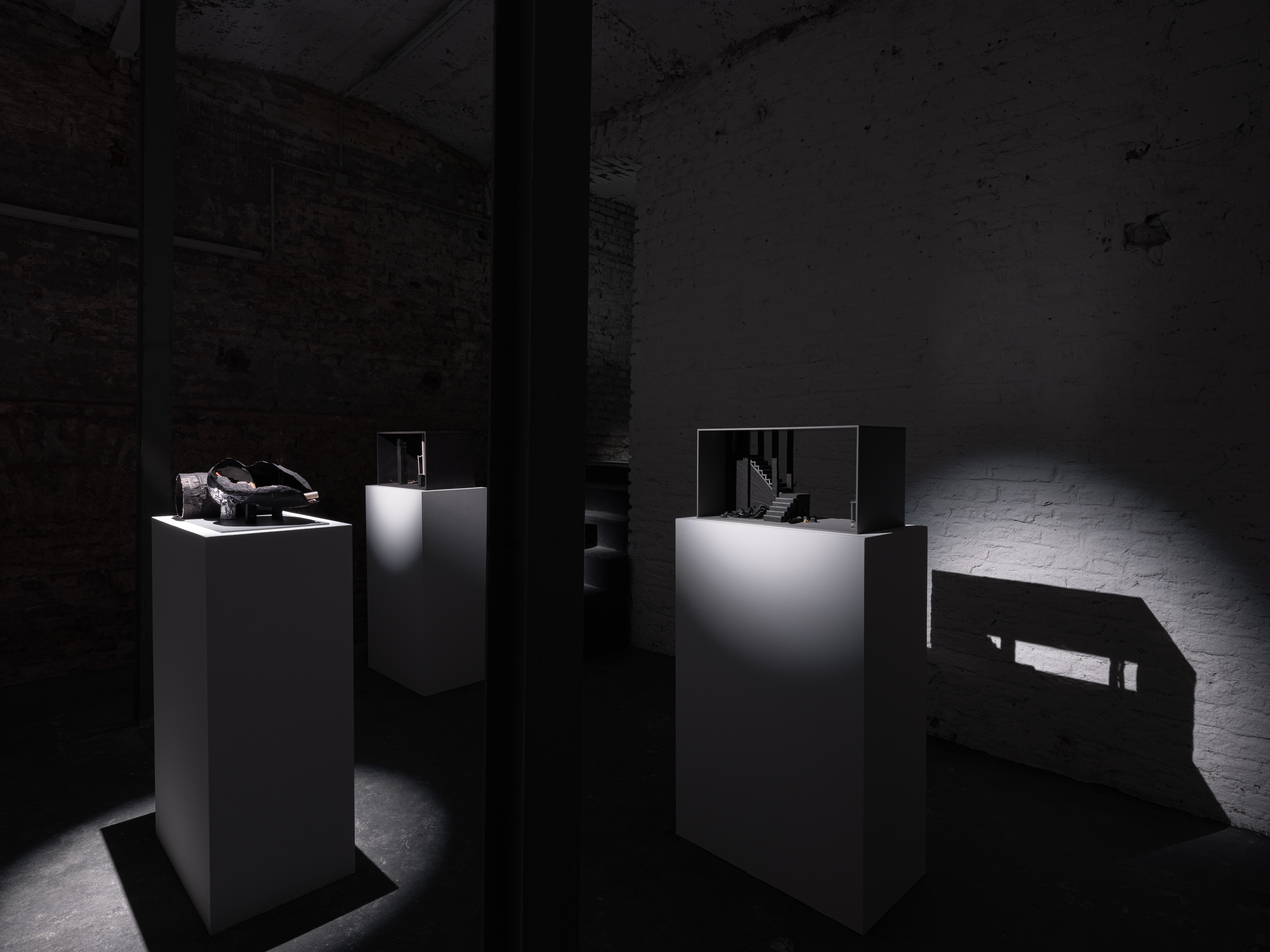 Lors de mon séjour à Cologne, il m’a semblé que les personnes que j’ai rencontrées étaient davantage préoccupées par les enjeux actuels que par le souvenir d’un passé révolu. Parmi toutes mes visites, deux expositions ont particulièrement retenu mon attention. Celle de Terry Adkintson à la galerie Josey, sur laquelle je n’ai pas la possibilité de revenir dans ce court compte-rendu ainsi que celle de Günther Möbius à la galerie Clementin Seedorf. Récemment diplômé de la Städelschule, Günther Möbius a consacré sa première exposition personnelle à concevoir les contours fantasmés d’une ville imaginaire préfasciste dans l’hypothèse où la République de Weimar aurait perduré plus longtemps, laissant enfler la crise du logement, l’hyperinflation et le fascisme. Pour The Golem of Berlin, il a réalisé plusieurs maquettes, parfois représentant des intérieurs, parfois des bâtiments bricolés, fabriquées à partir de mousse, de fils métalliques, de câbles, d’éléments en plastique et de black foil, utilisé dans l’industrie du cinéma pour contrôler la lumière. Les maquettes sont installées sur des socles dans la pénombre de Clementin Seedorf, une galerie située elle-même dans la cave d’un immeuble. Éclairées par des spots qui accentuent l’atmosphère théâtrale, les sculptures sur socles jouent du lugubre et de sa mise en scène. Au sein de cette crypte, il s’agit pour Günther Möbius de créer la sensation désagréable d’une superstructure golémique, organique et aspirante. Recréant une infrastructure apparemment tentaculaire mais constituée de rebuts et de déchets, Moebius s’applique à transmettre la sensation du gouffre des bricolages utopiques, des ramifications infinies de l’alternatif et du potentiel en période de crise. L’exposition devient elle-même un golem, à la fois créature du folklore juif et entité robotique contemporaine, un être fabriqué artificiellement dans lequel on se perd, créé pour éviter la crise mais qui devient aisément incontrôlable, finissant par précipiter, par sa folie, le drame qu’elle devait possiblement permettre d’éviter.